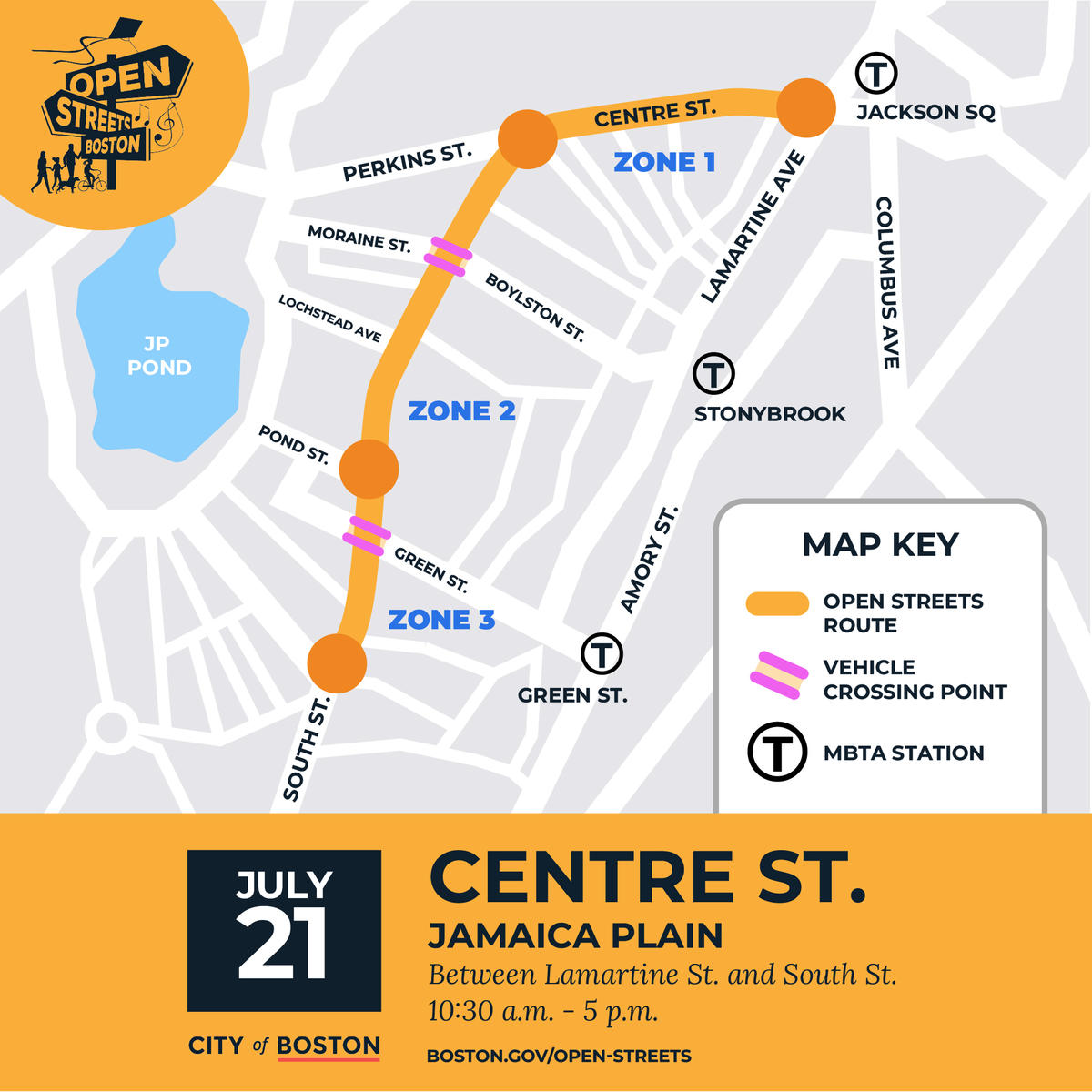Located on Centre St. between Lamartine St. to South St,. This event invites you to immerse yourself in the community’s rich culture. Make your way along the route and explore a medley of local businesses, activity zones, live music, and food! Here youāll find everything from face painting, yummy treats from local food vendors, interactive art, and more! Embrace the spirit of togetherness along this car-free route from 10:30 a.m. to 5:00 p.m.āit’s an unforgettable celebration of Jamaica Plain’s community that is free for the public to attend.