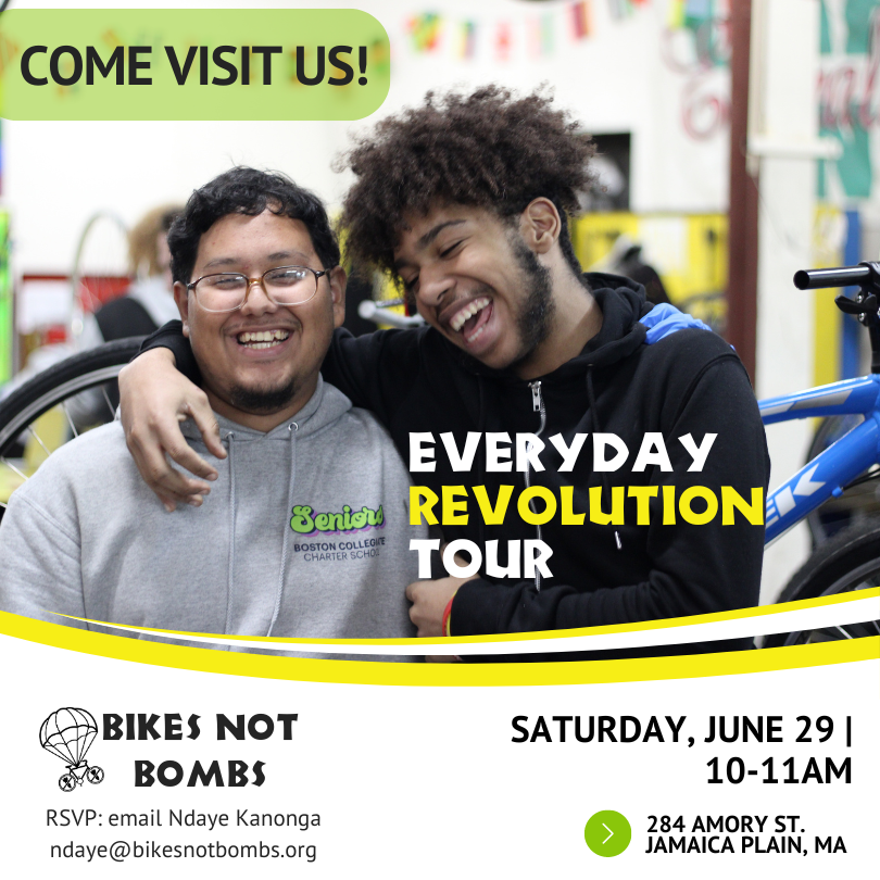 Donāt hesitate,Ā sign upĀ and join our next tour scheduled forĀ Saturday June 29thĀ from 10am to 11am at Bikes Not Bombs.