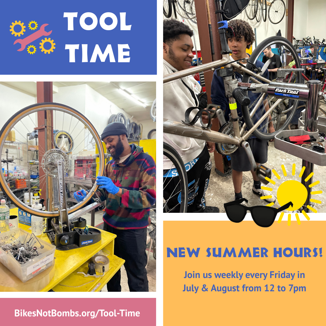 Tool Time is a DIY bike kitchen space at Bikes Not Bombs. No experience is necessary as long as you’re willing to do the work and learn! If you need a new part, component, or accessory, our Bike Shop has new & used options available for purchase.