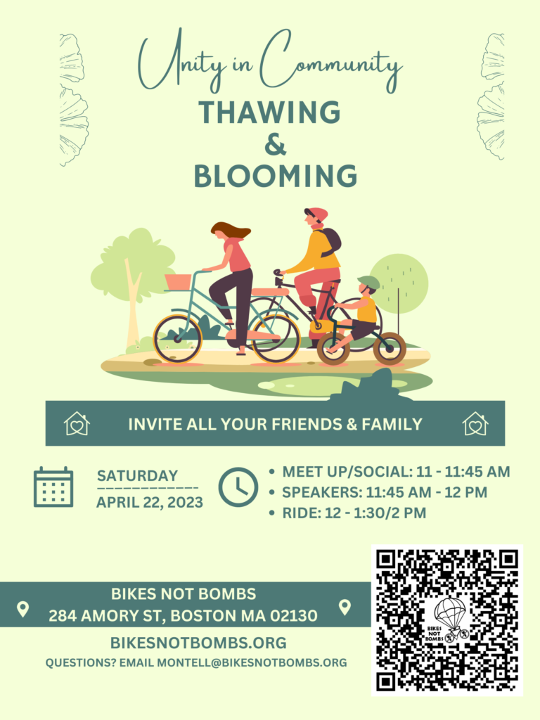 Join us for the kick-off ride of our Unity in Community series on Saturday, April 22nd 2023! Whether you’ve been biking all winter or, like some of us here at the shop, left your bike in storage while we wait for warmer weather, this event is for you! Thaw out your bike and come together to join in community and blossom with your friends in the larger bike-pedestrian organizing and advocacy space.