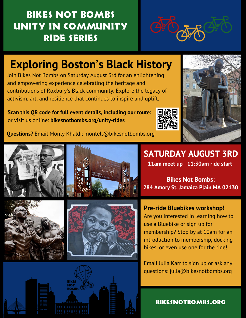 Join Bikes Not Bombs on our fifth Unity in Community Ride of the 2024 season on Saturday August 3rd for an enlightening and empowering experience celebrating the heritage and contributions of Roxbury’s Black community.
