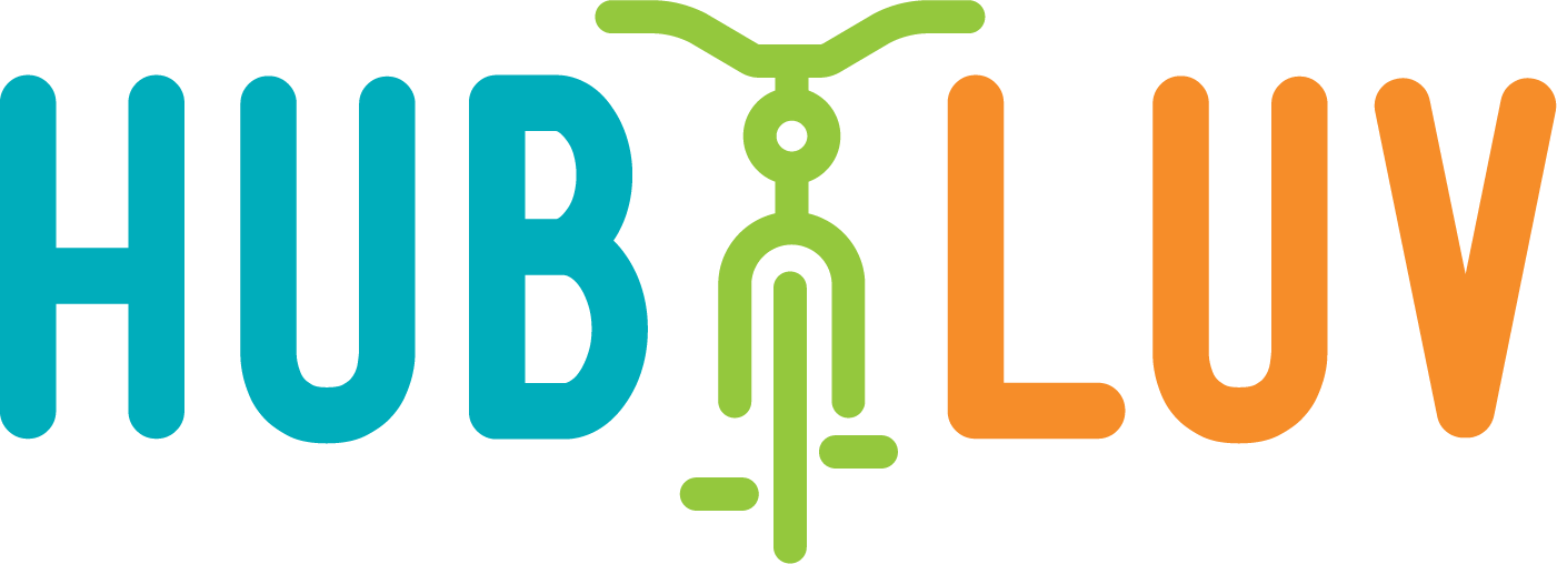 Logo for Hub Luv, showing a bicycle in between the two words.